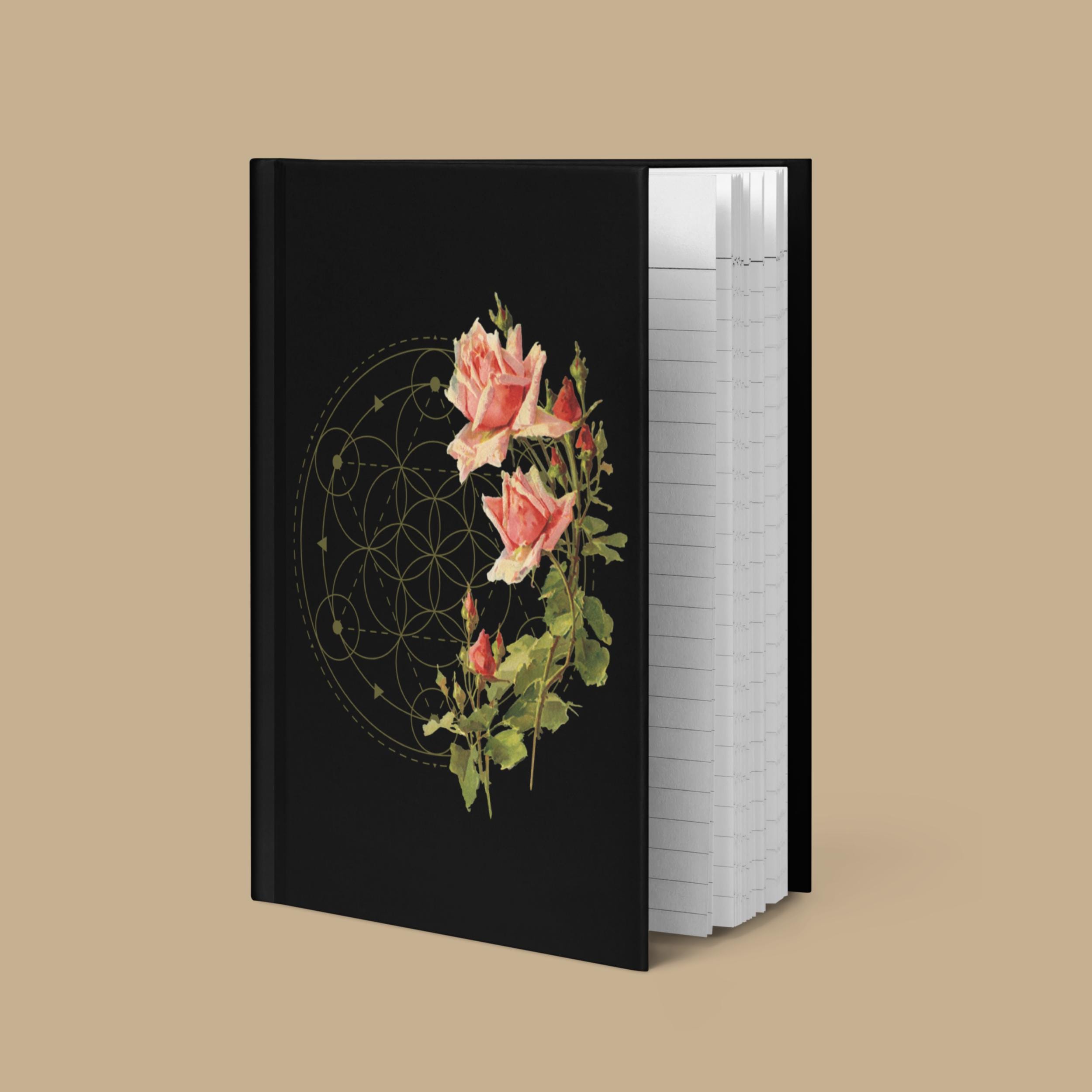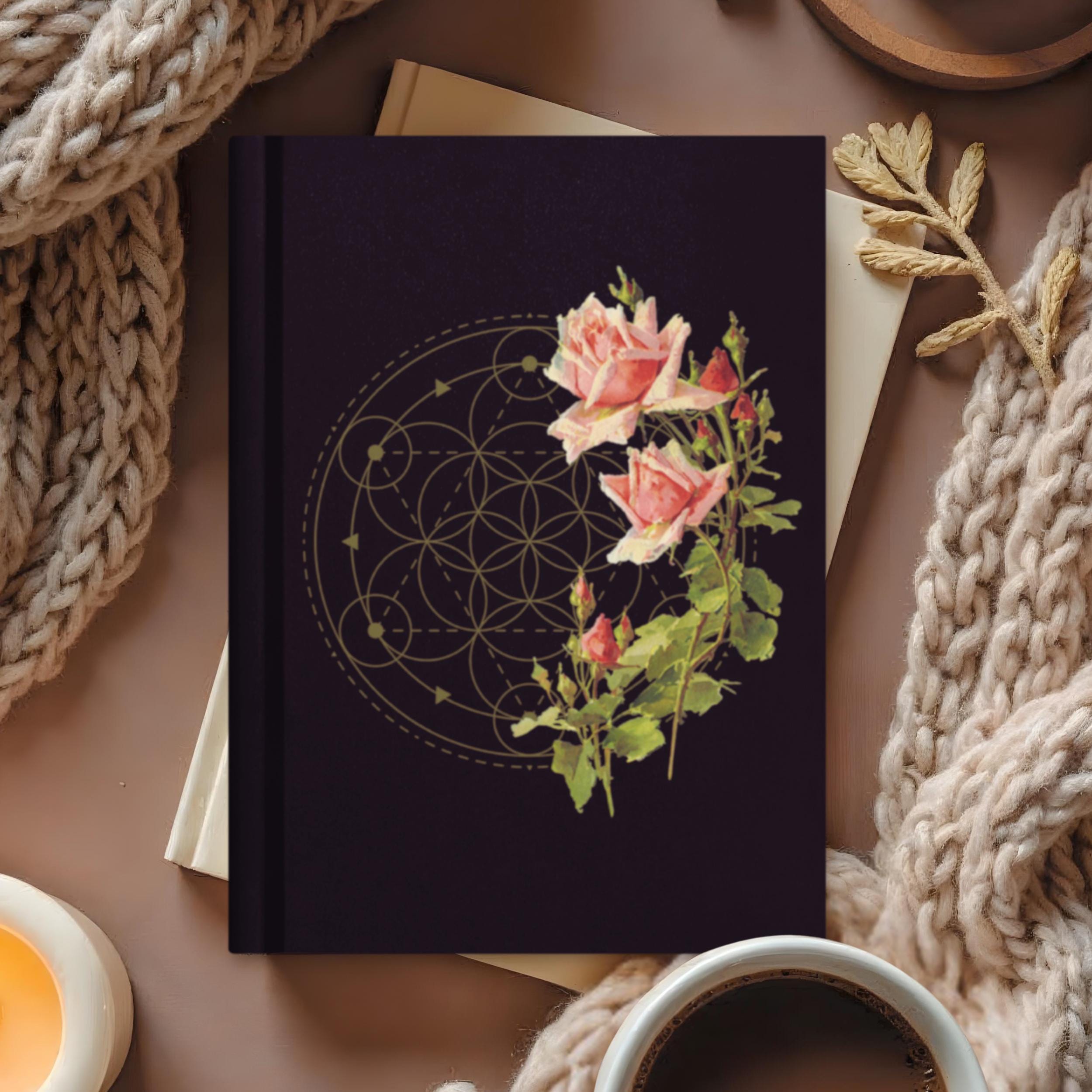 This elegant hardcover notebook brings together a beautiful image of vintage pink roses and a Sacred Geometry Mandala design on a velvety black cover, creating a dramatic, magical aesthetic for everyday use. Sized at 5.75"x8" (14.6 cm × 20.3 cm), it’s easy to carry in your bag or backpack, whether you’re journaling at home, in a café, or on campus.