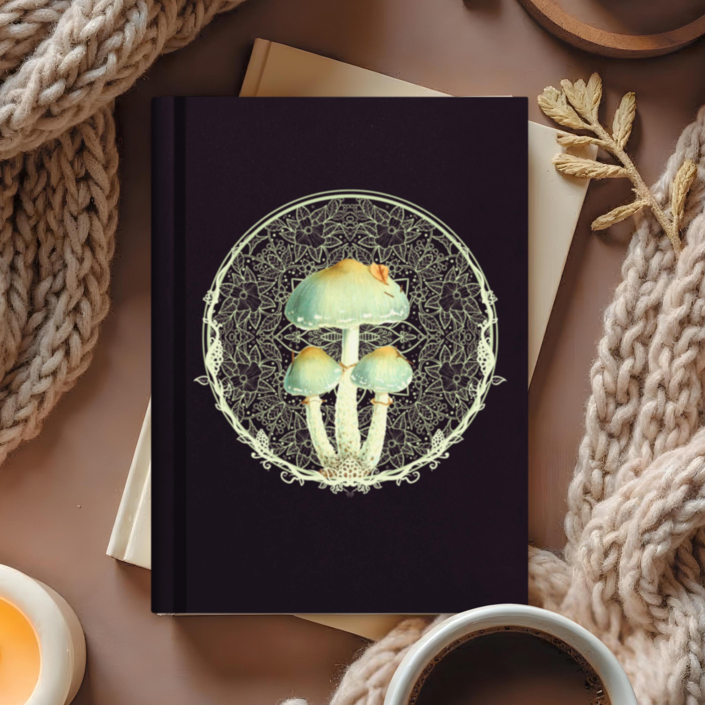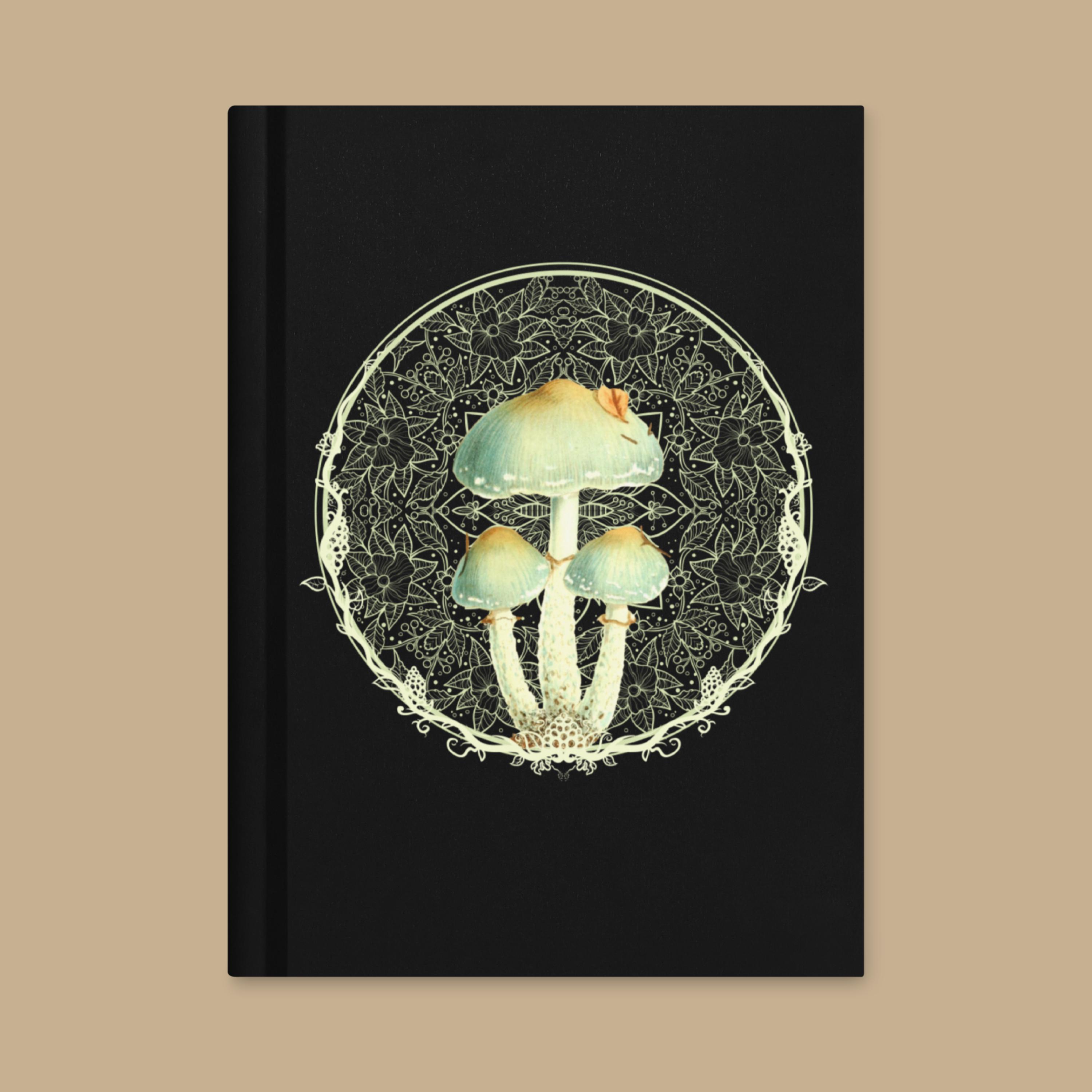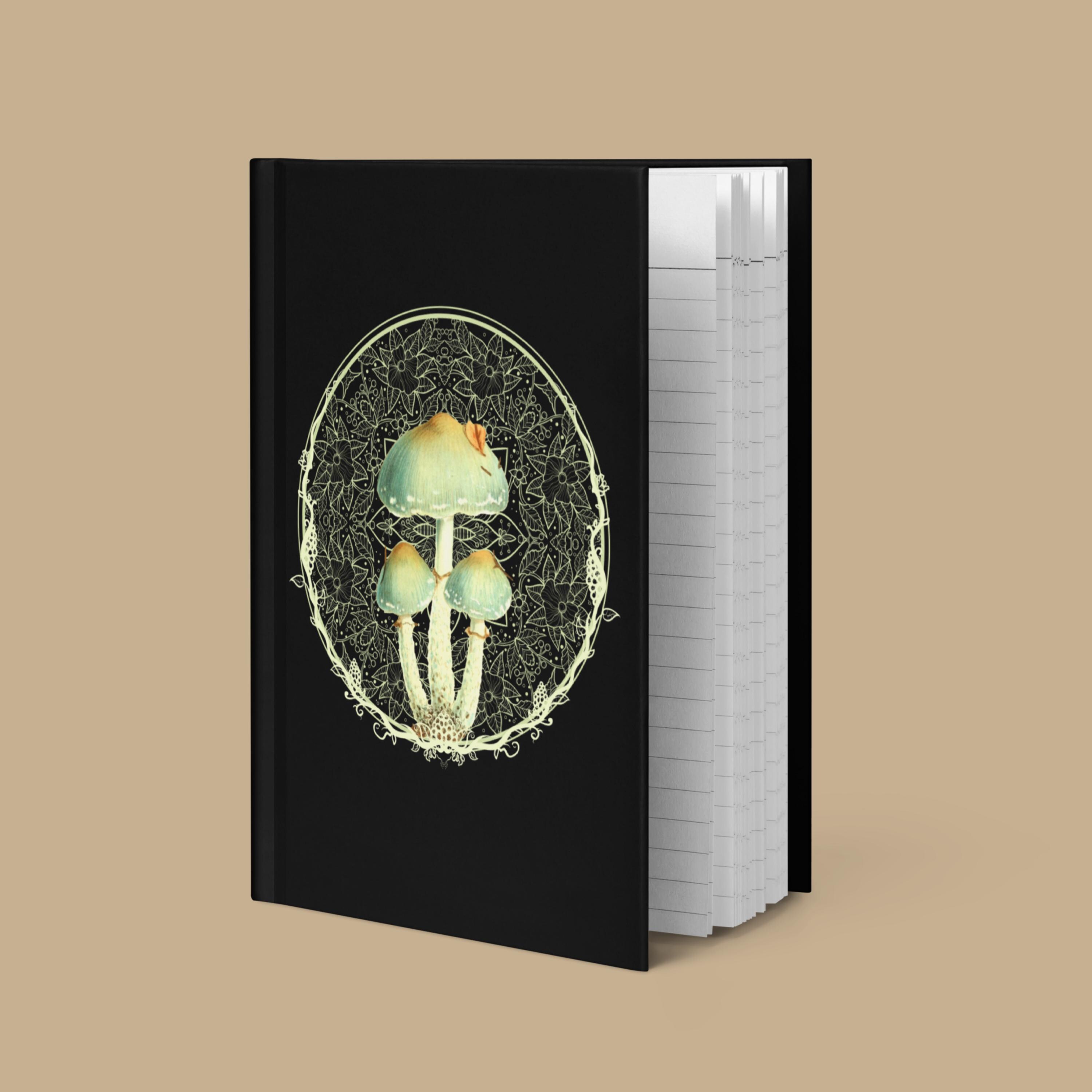 This elegant hardcover notebook brings together a beautiful image of whimsical magic mushrooms with a floral mandala design on a velvety black cover, creating a dramatic, magical aesthetic for everyday use. Sized at 5.75"x8" (14.6 cm × 20.3 cm), it’s easy to carry in your bag or backpack, whether you’re journaling at home, in a café, or on campus.
