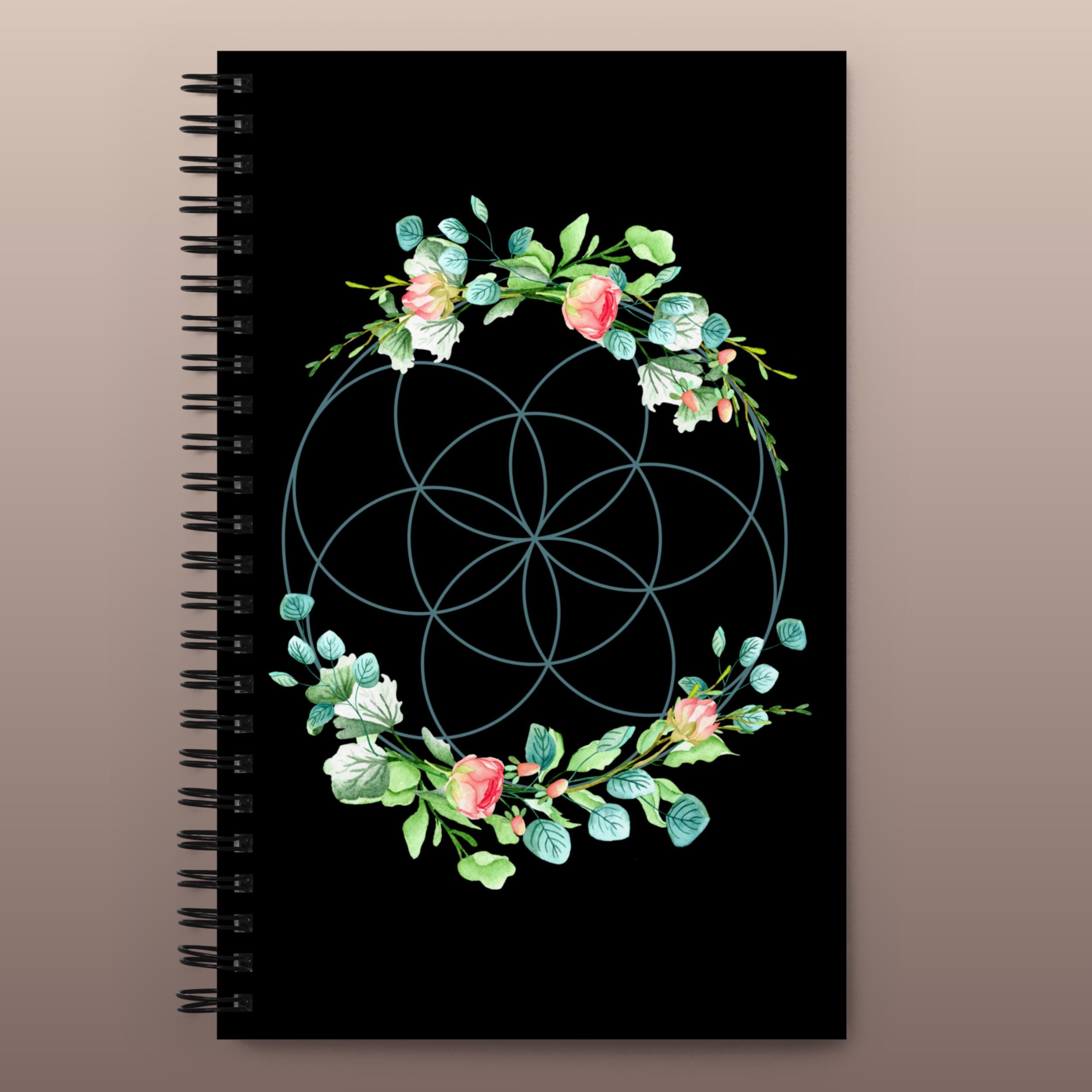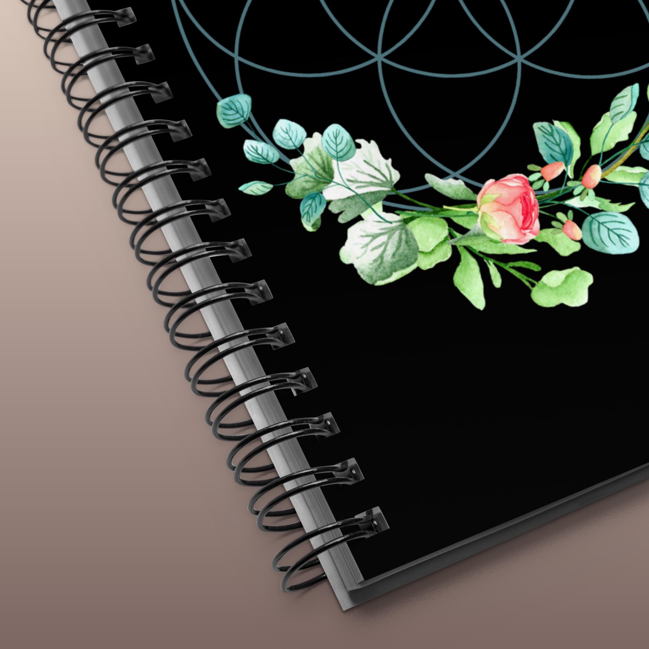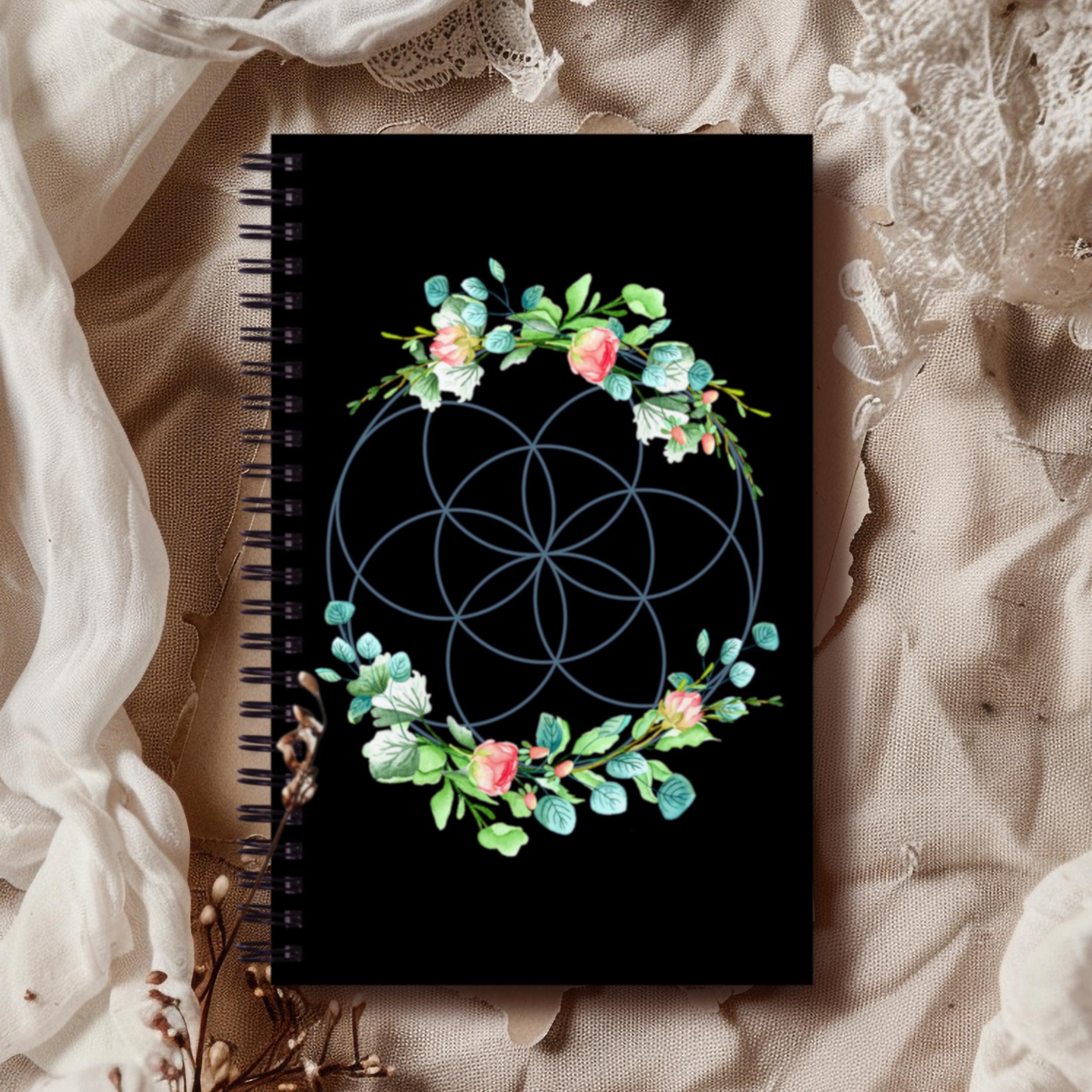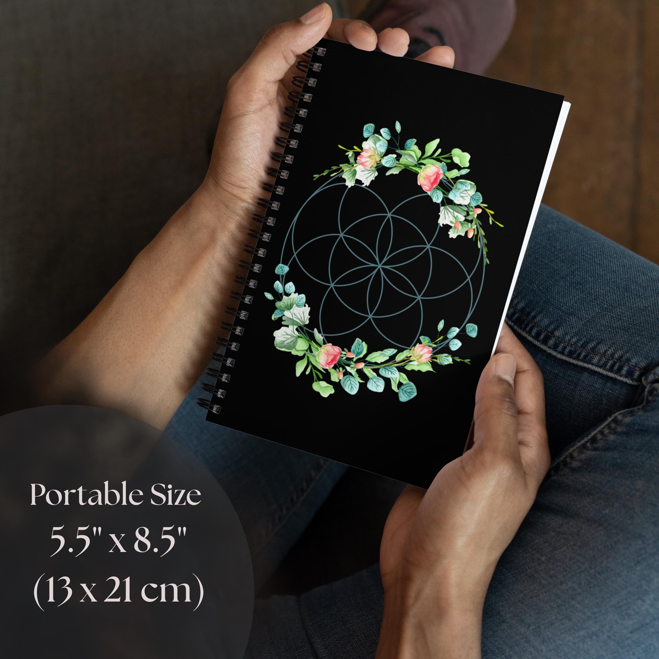 This Sacred Geometry spiral notebook brings together a beautiful image of a watercolor floral wreath and the 'Seed of Life' design on a velvety black cover, creating a soft, feminine aesthetic for everyday use. Sized at 5.5" × 8.5" (13 × 21 cm), it’s easy to carry in your bag or backpack, whether you’re journaling at home, in a café, or on campus.