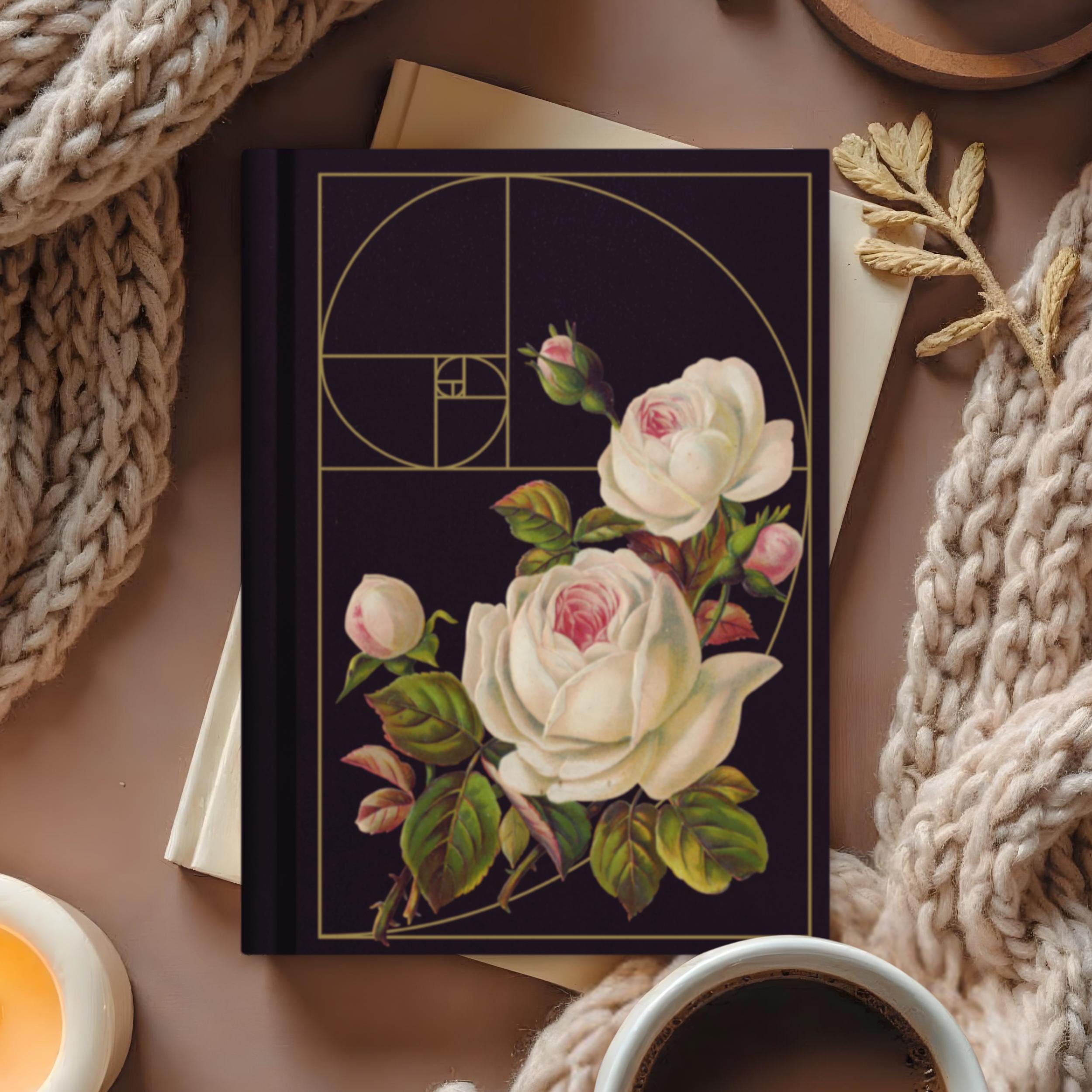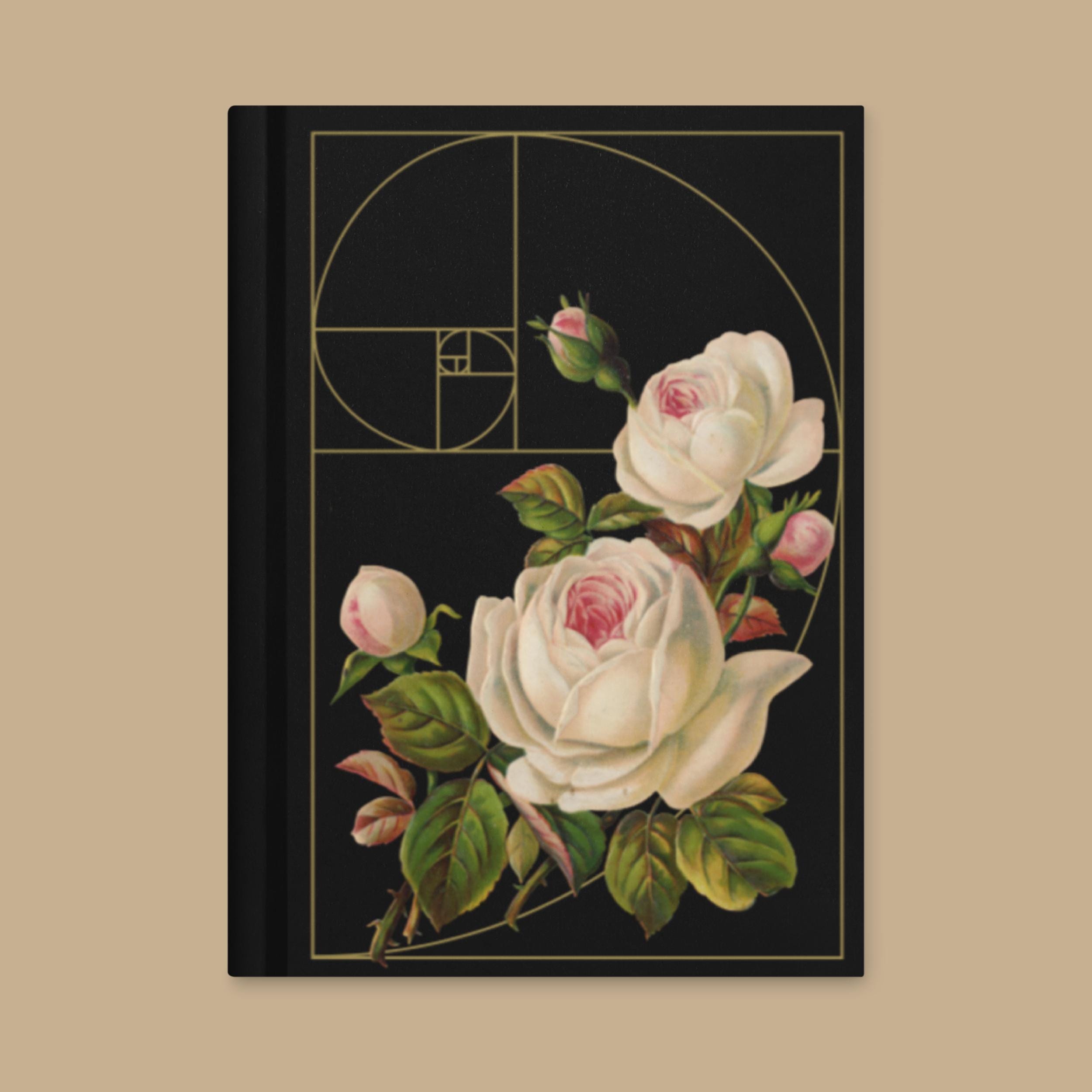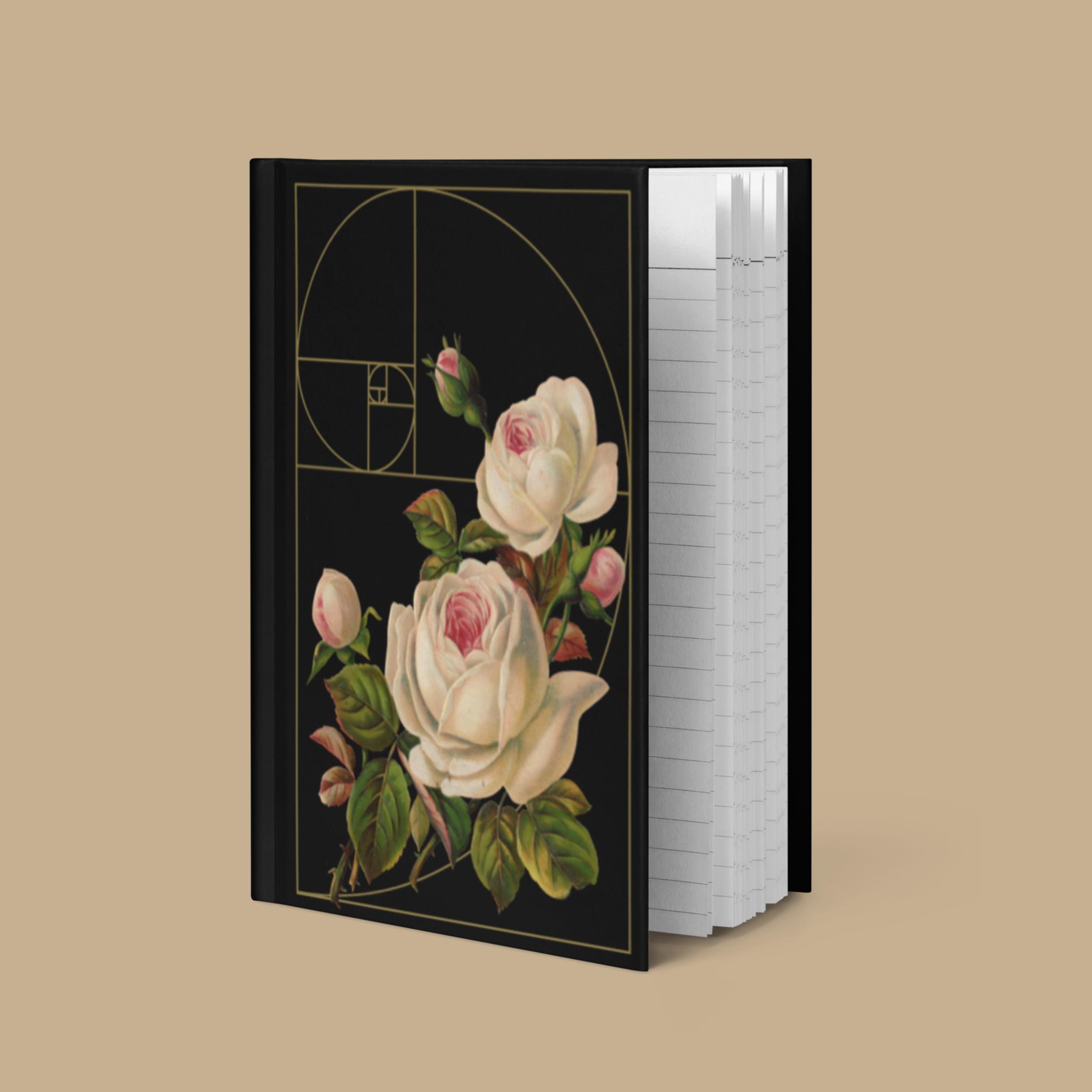 This elegant hardcover notebook brings together a beautiful image of vintage white roses and the sacred Golden Ratio spiral on a velvety black cover, creating a dramatic, intelligent aesthetic for everyday use. Sized at 5.75"x8" (14.6 cm × 20.3 cm), it’s easy to carry in your bag or backpack, whether you’re journaling at home, in a café, or on campus.