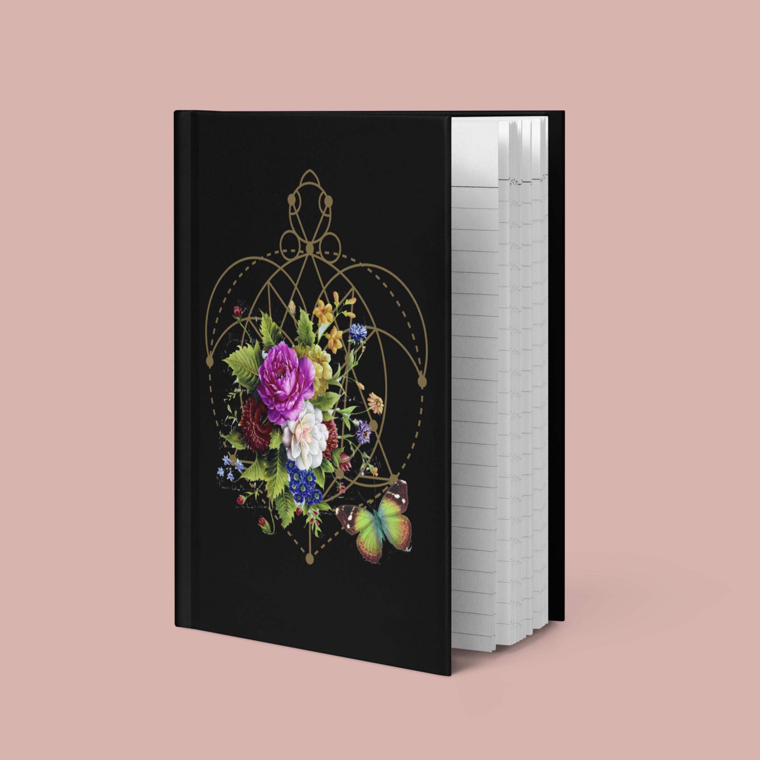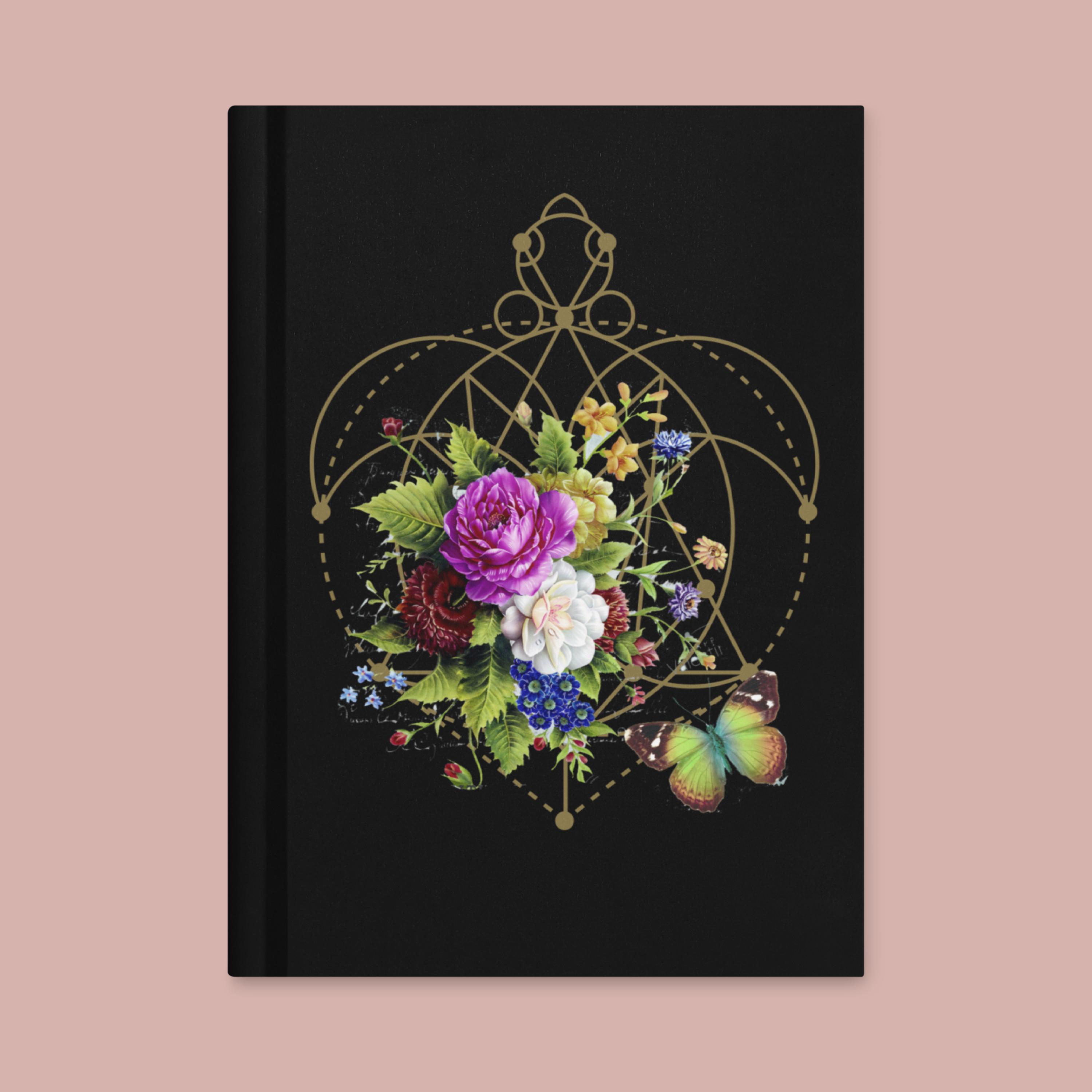 This gorgeous hardcover notebook brings together a beautiful image of a vintage floral bouquet and butterfly with a Sacred Geometry heart chakra energy design on a velvety black cover, creating a dramatic and lovely aesthetic for everyday use. Sized at 5.75"x8" (14.6 cm × 20.3 cm), it’s easy to carry in your bag or backpack, whether you’re journaling at home, in a café, or on campus.