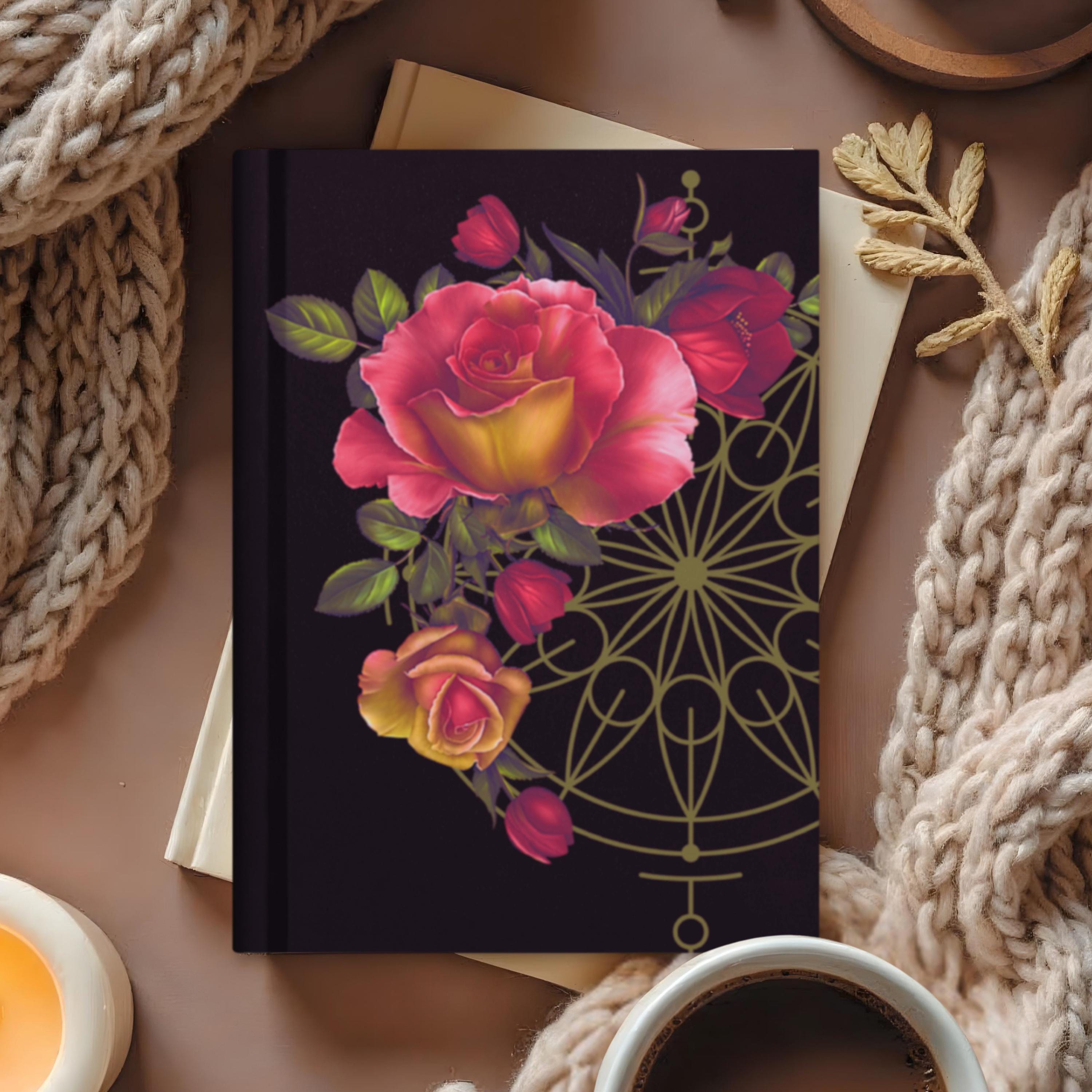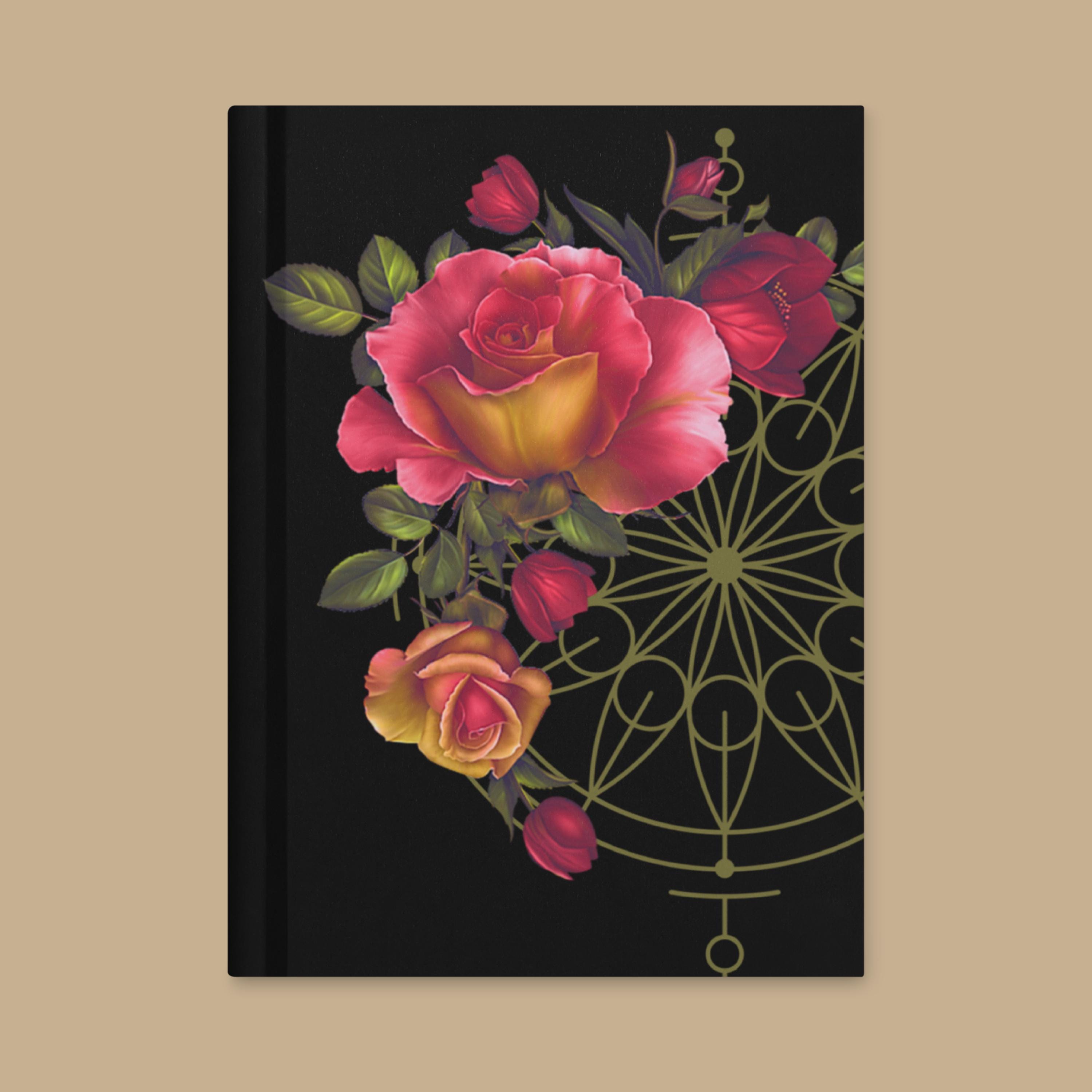 This stylish hardcover notebook brings together a stunning image of vintage two-toned Roses with a Wheel of Fortune sacred Mandala design on a velvety black cover, creating a dramatic and beautiful aesthetic for everyday use. Sized at 5.75"x8" (14.6 cm × 20.3 cm), it’s easy to carry in your bag or backpack, whether you’re journaling at home, in a café, or on campus.