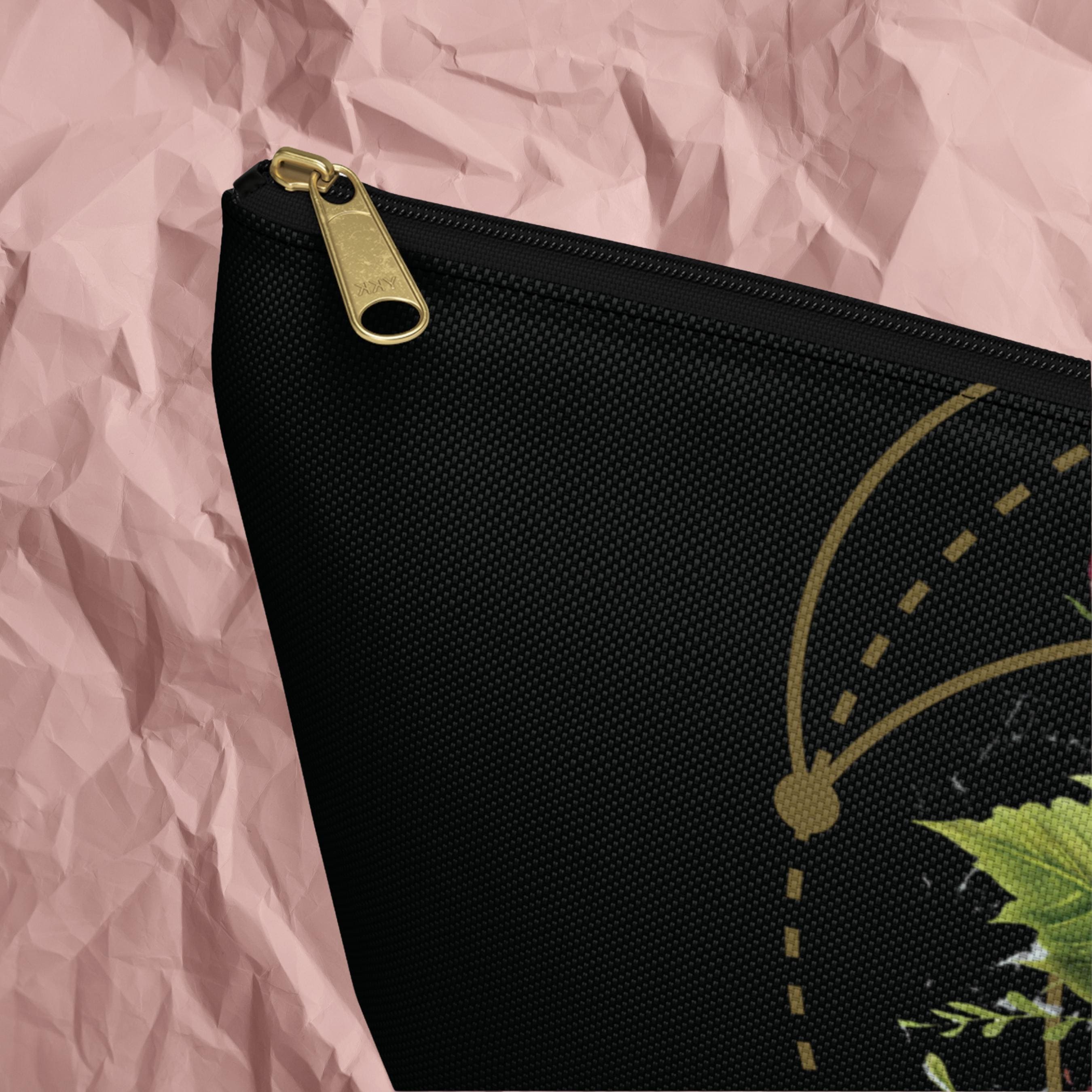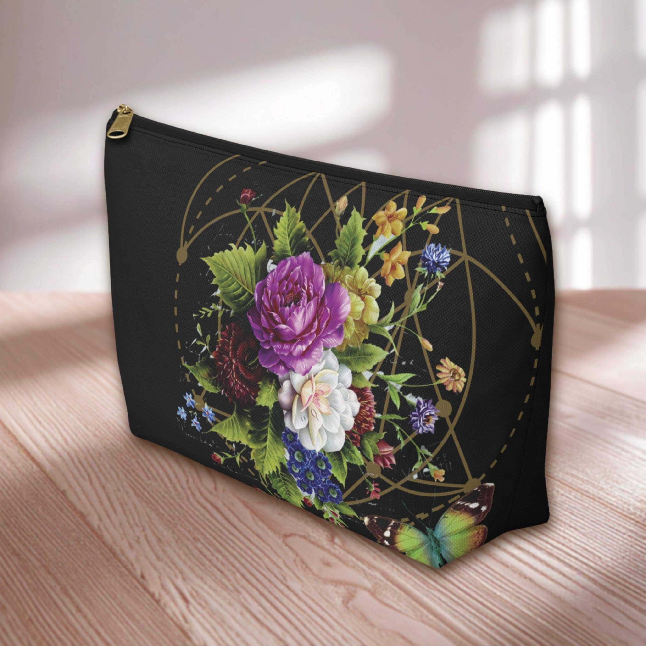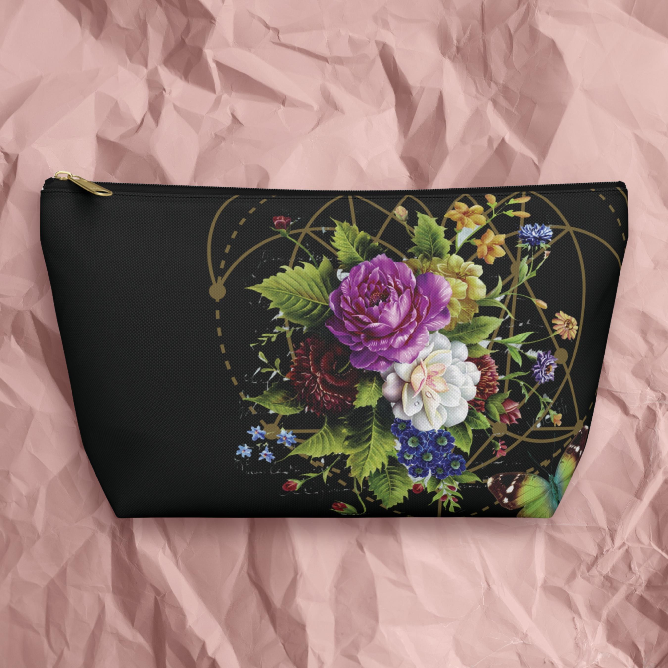 A refined accessory pouch that blends vintage botanical art with a touch of geometric harmony. The deep black backdrop makes the colorful floral bouquet and rich green leaves sing, while the subtle 'Heart Chakra" Sacred geometry design adds a quiet nod to balance and proportion.