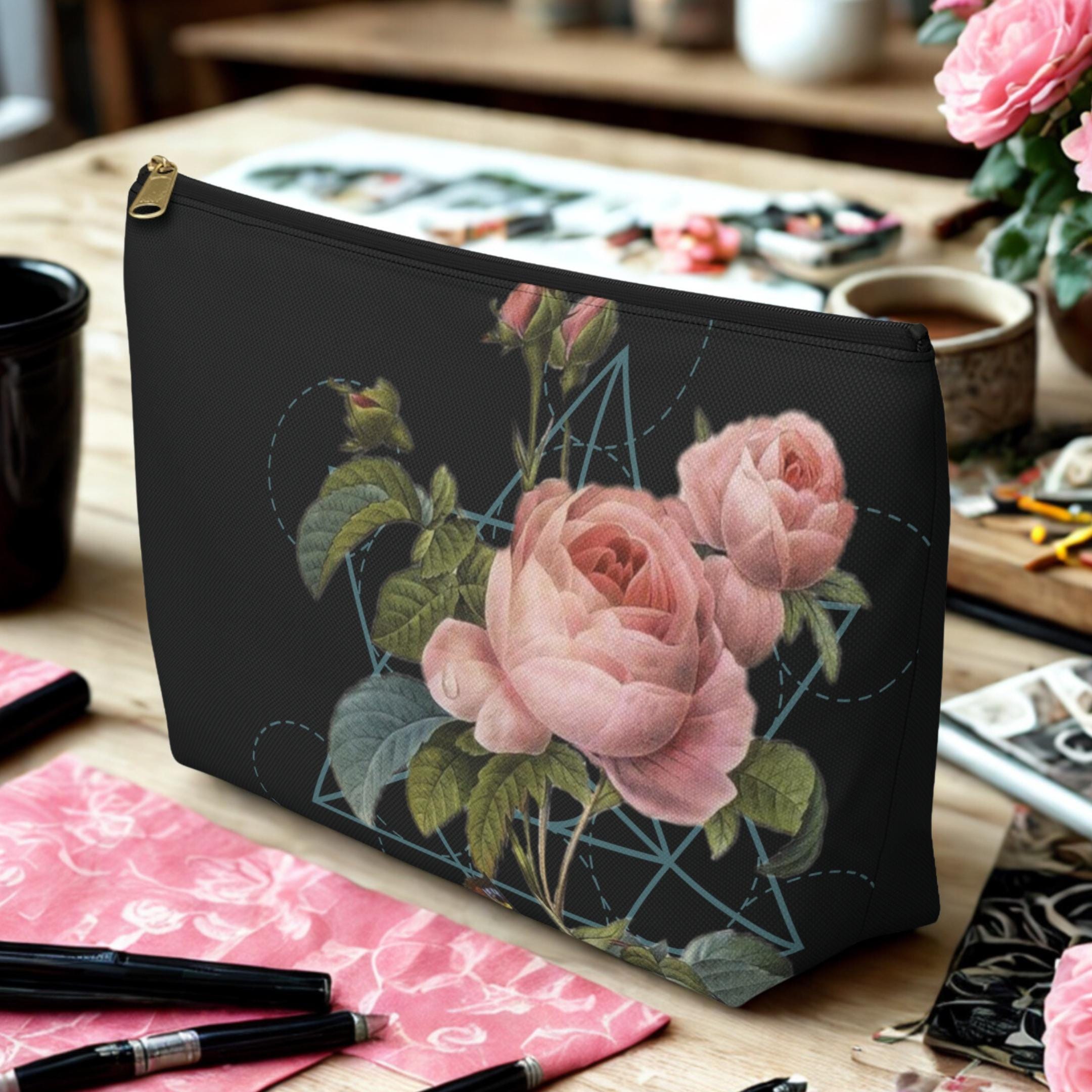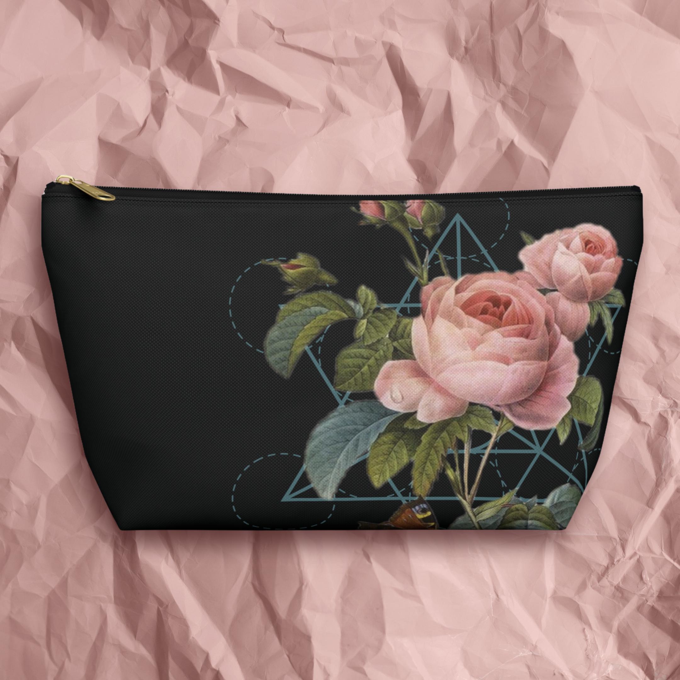 A refined accessory pouch that blends classic botanical art with a touch of geometric harmony. The deep black backdrop makes the blushing rose blossoms and rich green leaves pop, while the subtle Merkabah, or Star Tetrahedron, of Sacred Geometry adds a quiet nod to balance and proportion.